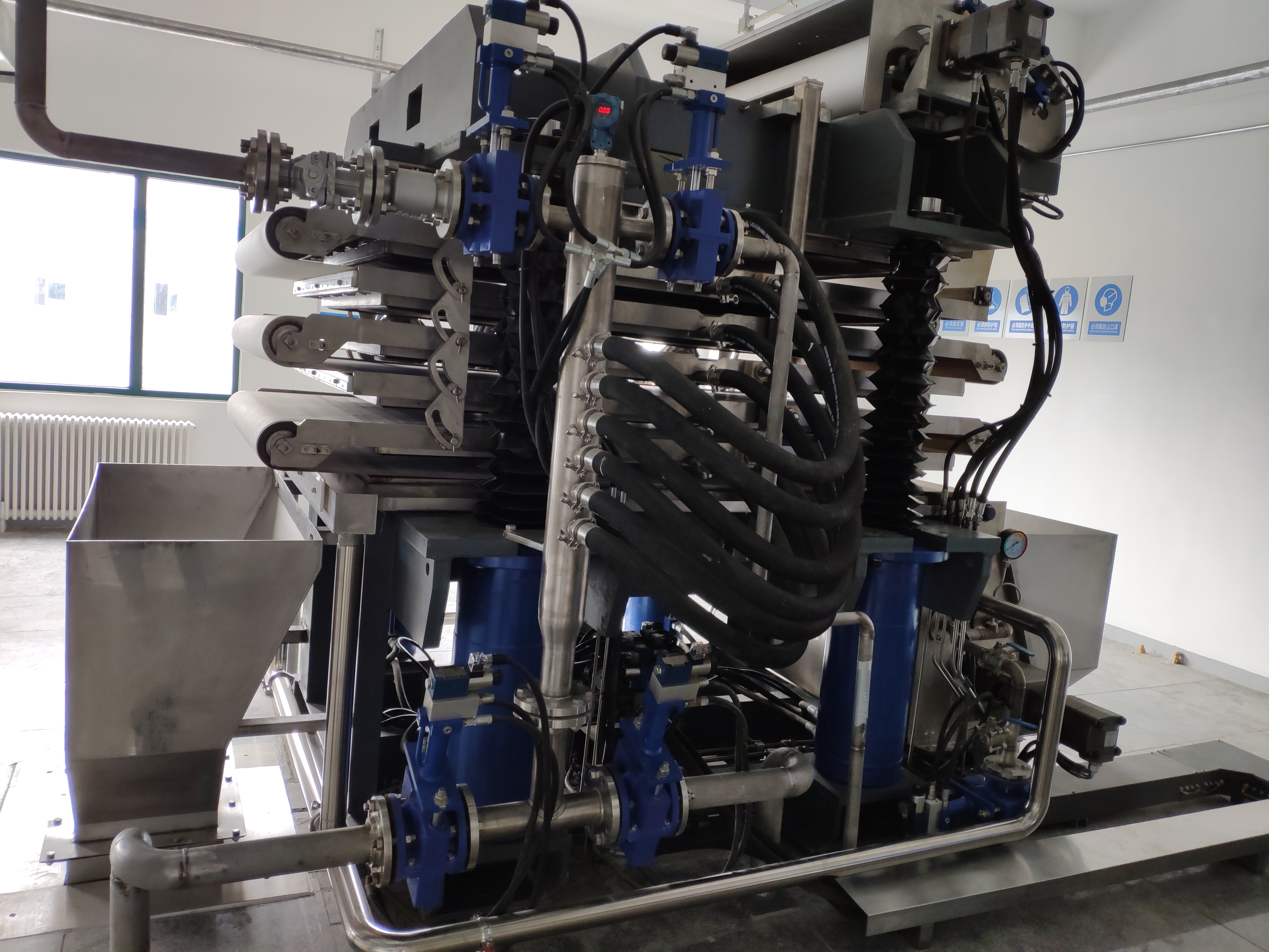 We developed LZB series vertical full automatic plate-frame press filter in 2006. Through pressurizing, the slurry material goes through the filtration medium, then the solid and liquid are separated in an efficient way. This Press filter features automatic rectifying, filtration cloth automatic washing, user-friendly interface etc, and can achieve automatic control and real time monitoring. It runs fully automatically, eco-friendly with lower power consumption and high yield.